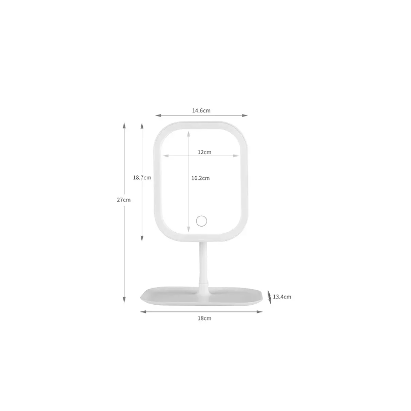 - Mirror dimensions: 18.7 x 14.6 cm (glass area), total height of the structure 27 cm, base 18 x 13.4 cm