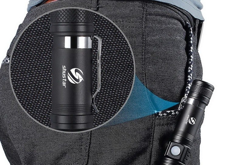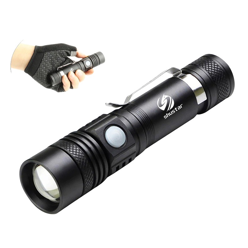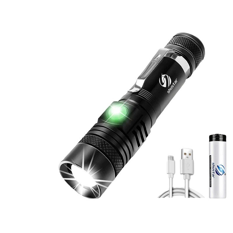 This LED rechargeable torch is made from aluminium alloy. It ensures high durability and long lifespan. Ideal for camping, outdoor activities, and home use. Additionally, it is waterproof, so you can use it in any weather. The luminous flux of 1000 lm ensures that you have enough light to see what lies ahead. It features several lighting modes, including SOS mode. The LED torch is also equipped with a battery status indicator.