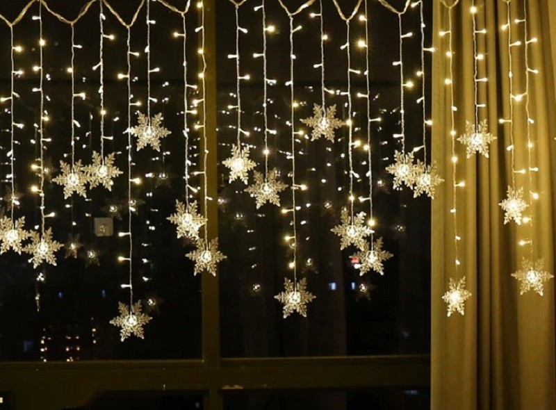 Indoor and outdoor lighting. Decoration. Material: copper, plastic. Waterproof rating: IP4. LED curtain. Length: 3.2 m. Size of snowflake: 5 cm. Power supply: from the socket. Full description