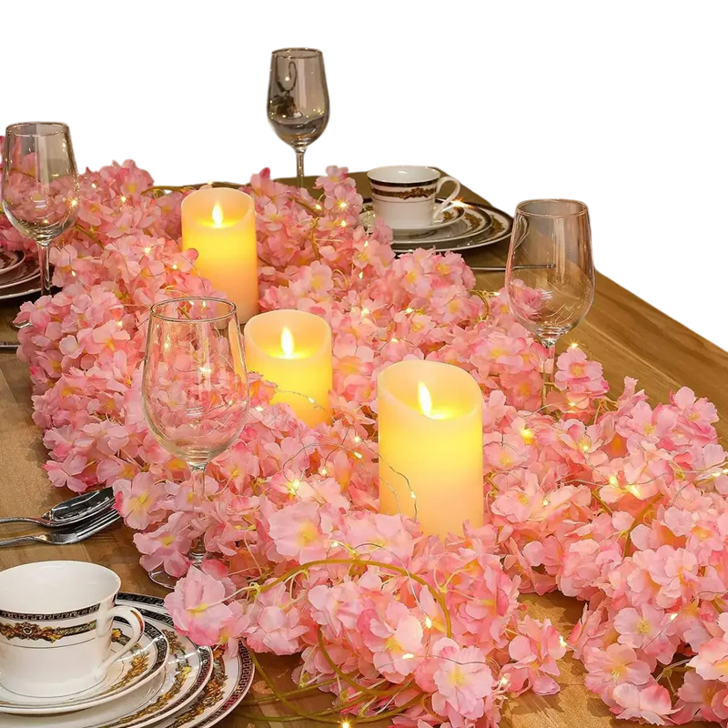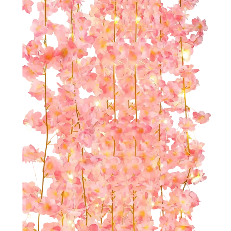 Elegant LED garland with pink cherry blossoms for romantic decoration at home and outdoors, ideal for weddings, parties, holidays, and everyday decor. Full description