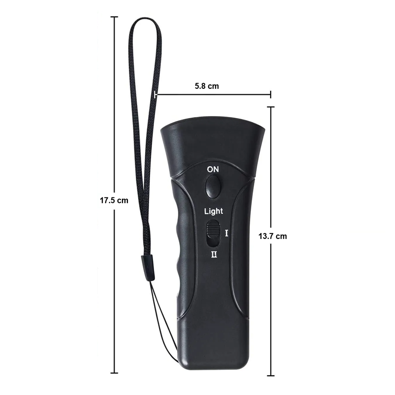 The ultrasonic dog repeller with LED light is a practical and effective training device that helps reduce unwanted barking and improves coexistence with dogs in both home and outdoor environments. The device emits ultrasonic pulses that are inaudible to humans but effectively affect a dog's hearing, helping to correct undesirable behaviour. It is suitable for all breeds of dogs, from pets to police or herding dogs. Thanks to its simple operation and compact size, it is ideal for everyday use. A 9V battery is required for operation, which is not included in the package.