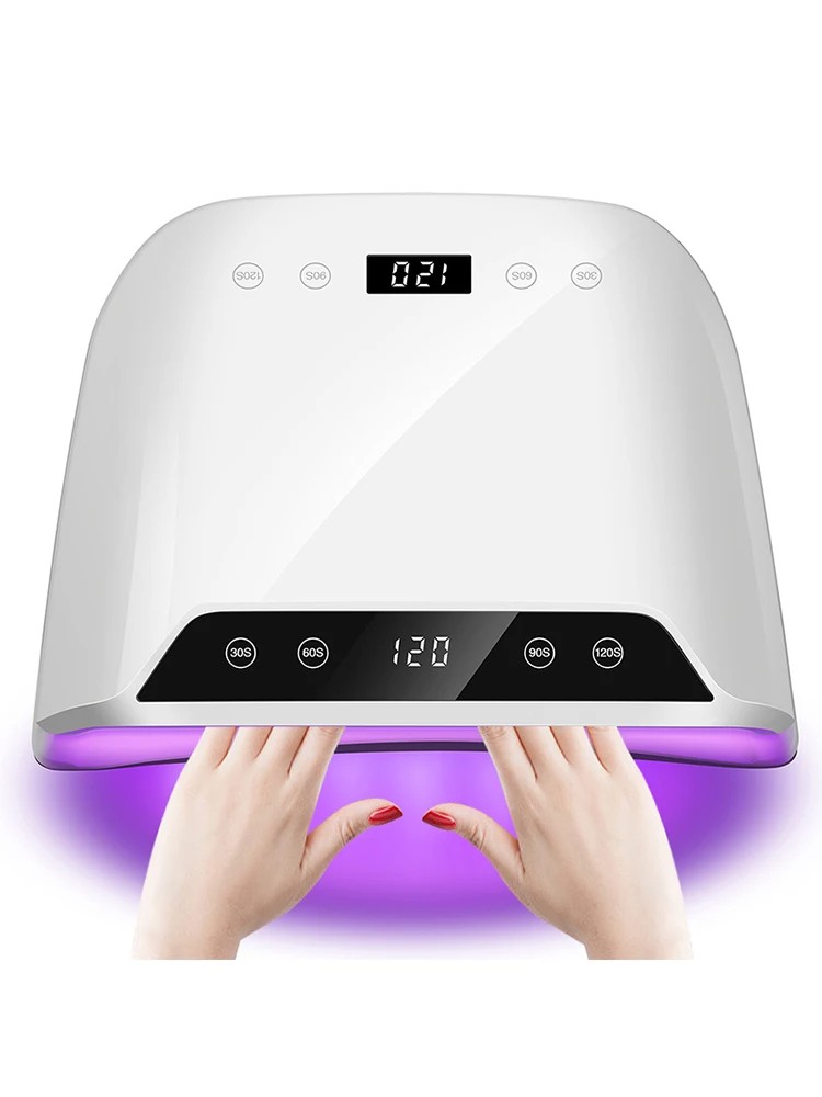 Powerful LED UV nail lamp with automatic sensor, 4 timers (30/60/90/120 s) and dual display for fast and even curing of gel polishes. Full description