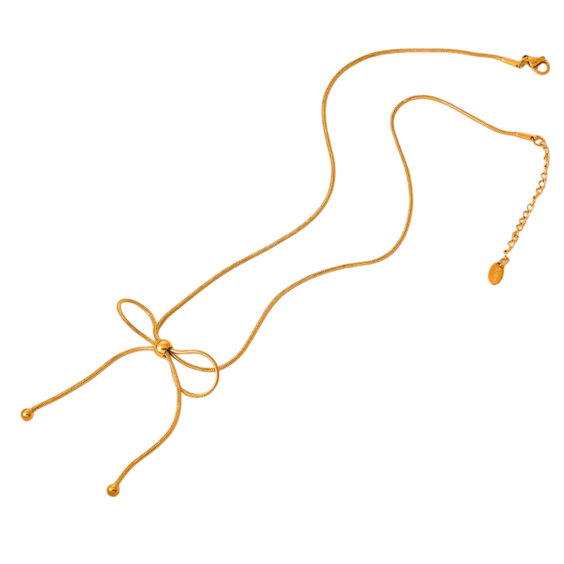 Delicate stainless steel necklace with a bow measuring 41.5 + 5.5 cm. An adjustable elegant accessory for everyday wear and special occasions. Full description