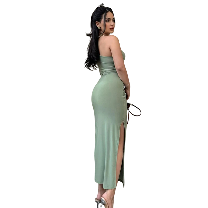 Home page Home page Clothing & Accessories Women’s Clothing Women’s Dresses Women’s Maxi Dresses Long Elegant Maxi Dress with Asymmetrical Strap Fitted Cut Pleating at the Waist High Slit Knee-Length Evening Dress