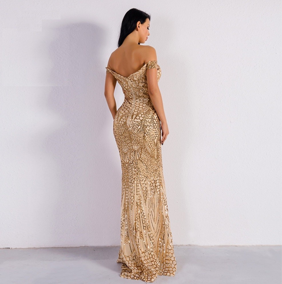 Women's dress with exposed shoulders.