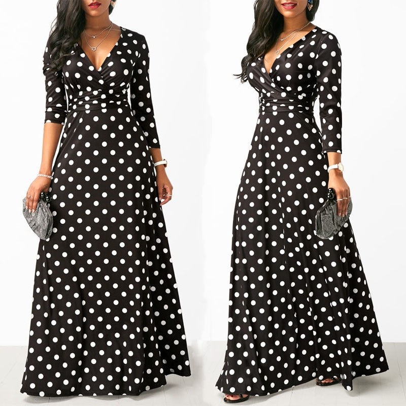 Beautiful black maxi dress with prominent white polka dots and a deeper neckline.