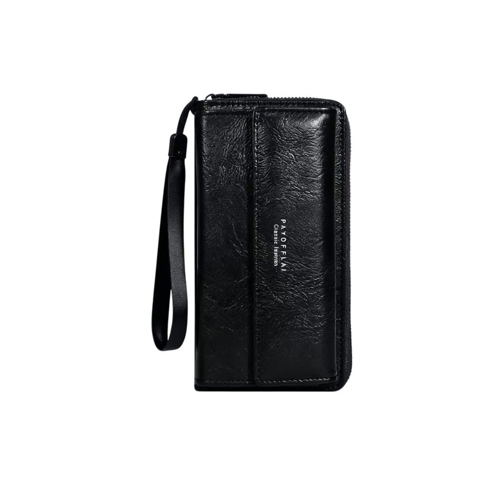 Practical long wallet with large capacity, zip and wrist strap. Clear organisation, synthetic leather and secure fastening. Full description