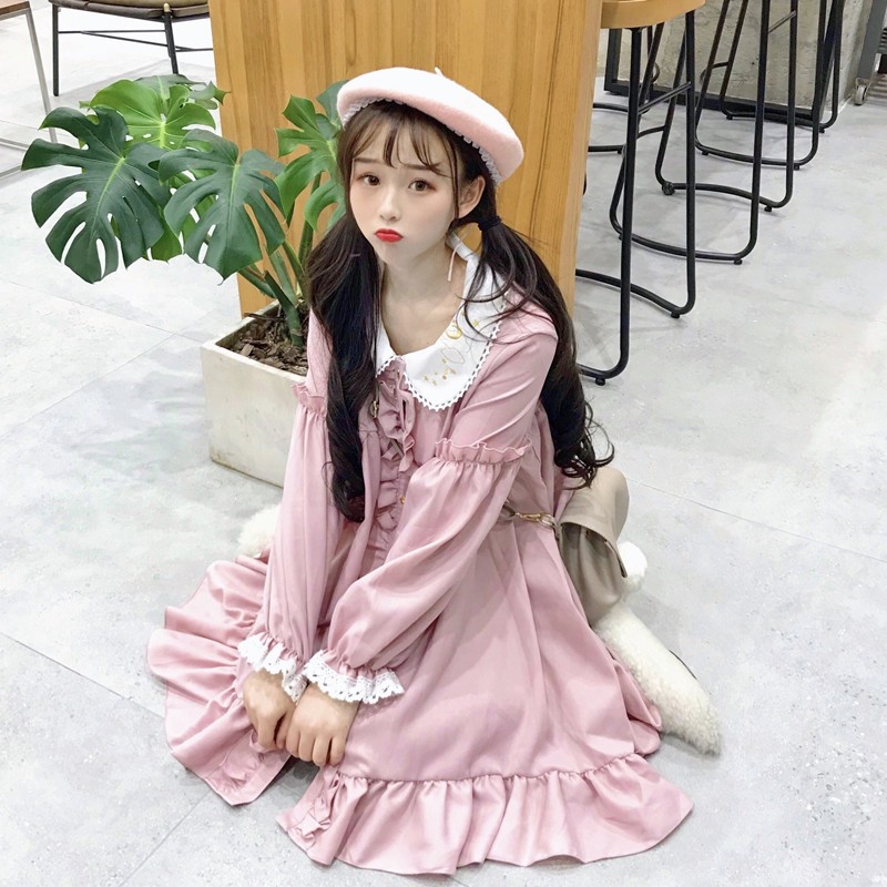 Sleeves and collar adorned with lace.