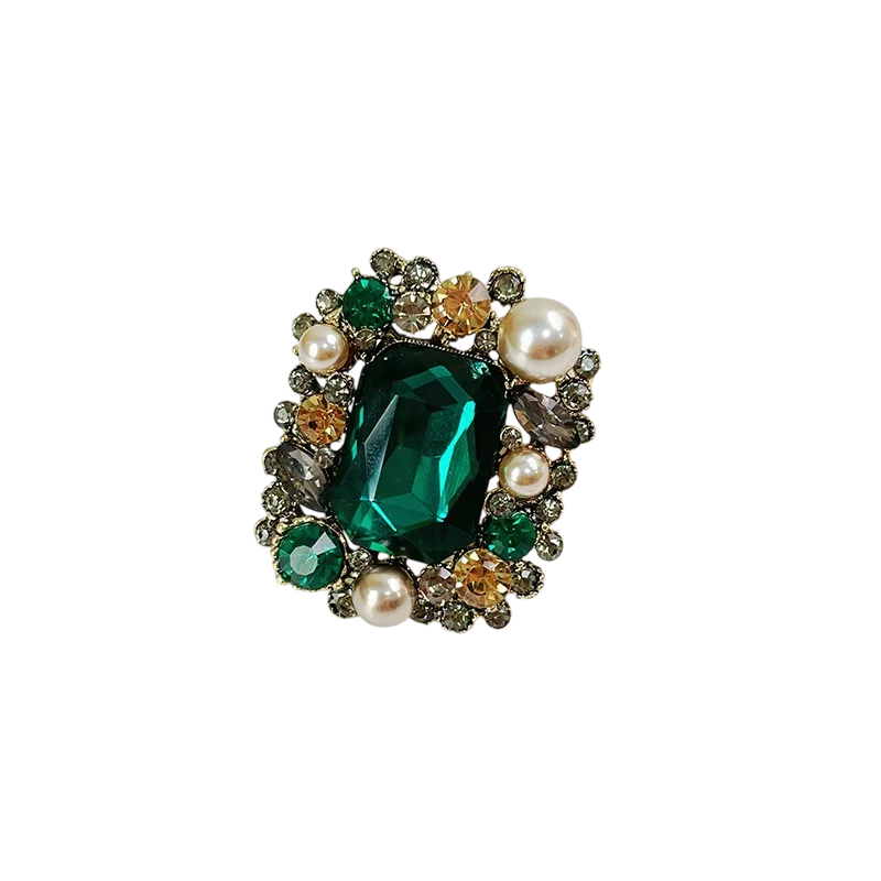 This luxury fashion brooch in a rectangular shape captivates with its clean geometric design and rich embellishments. The dominant gemstone is complemented by pearls and decorative stones, creating a balanced and elegant whole. The brooch has a representative appearance and is suitable as a striking accessory for both formal and social outfits. Thanks to its timeless shape, it easily pairs with various clothing styles. This piece of jewellery is the ideal choice for women who prefer luxurious yet tasteful accessories.