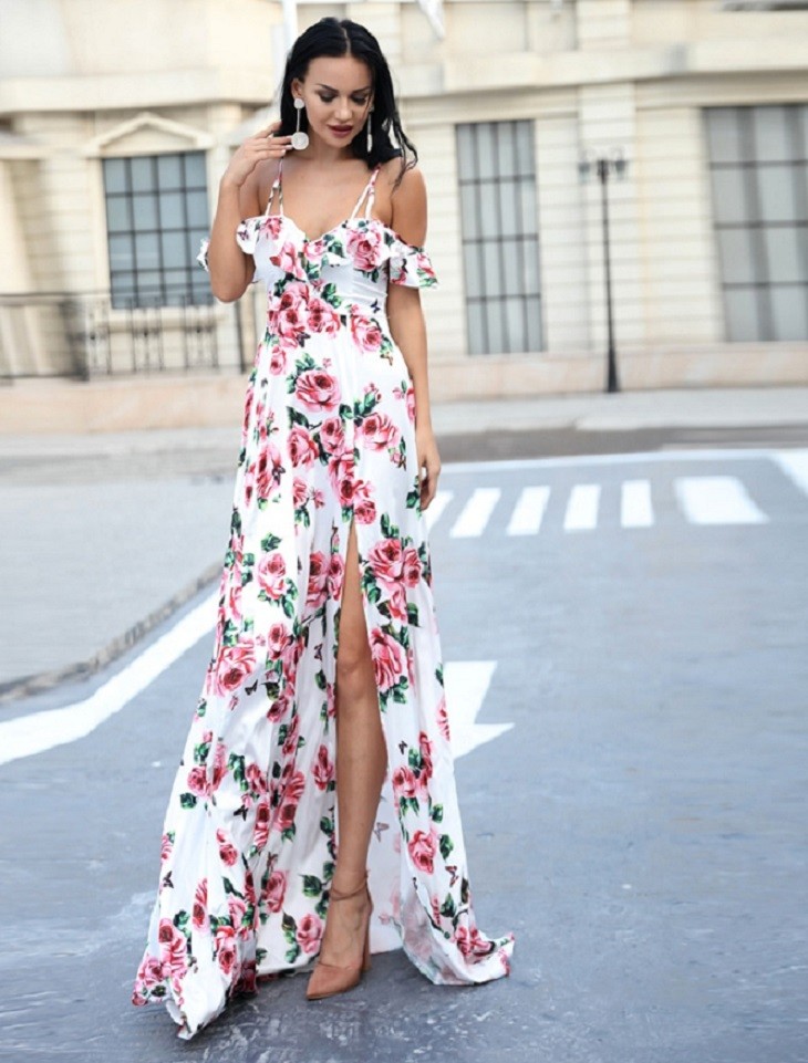 Beautiful long floral summer dress with off-the-shoulder sleeves.