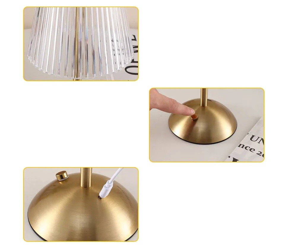 Modern luxury lamp with LED lighting, 3 brightness levels (cool white, warm white, neutral), metal construction, USB-C charging, 5V, 4W, height 29 cm, ideal for bedroom, living room or bar. Full description