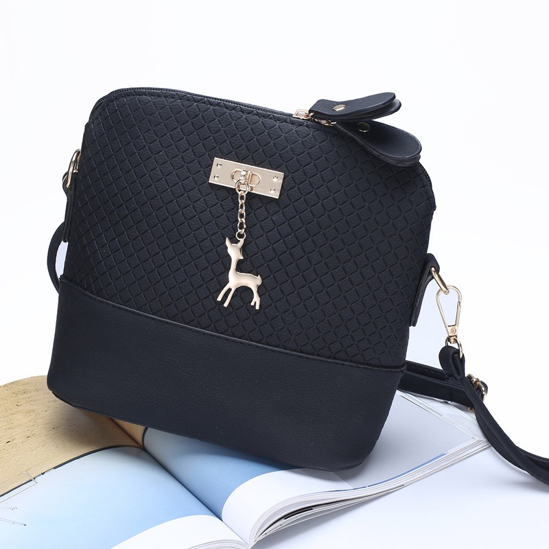 The handbag features a small golden fawn charm.