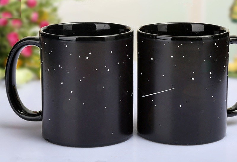 On this black mug with stars, all the planets will appear after pouring in hot water.