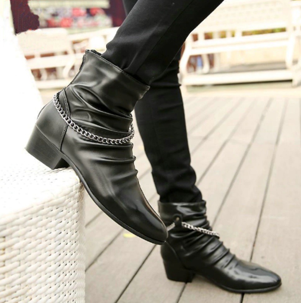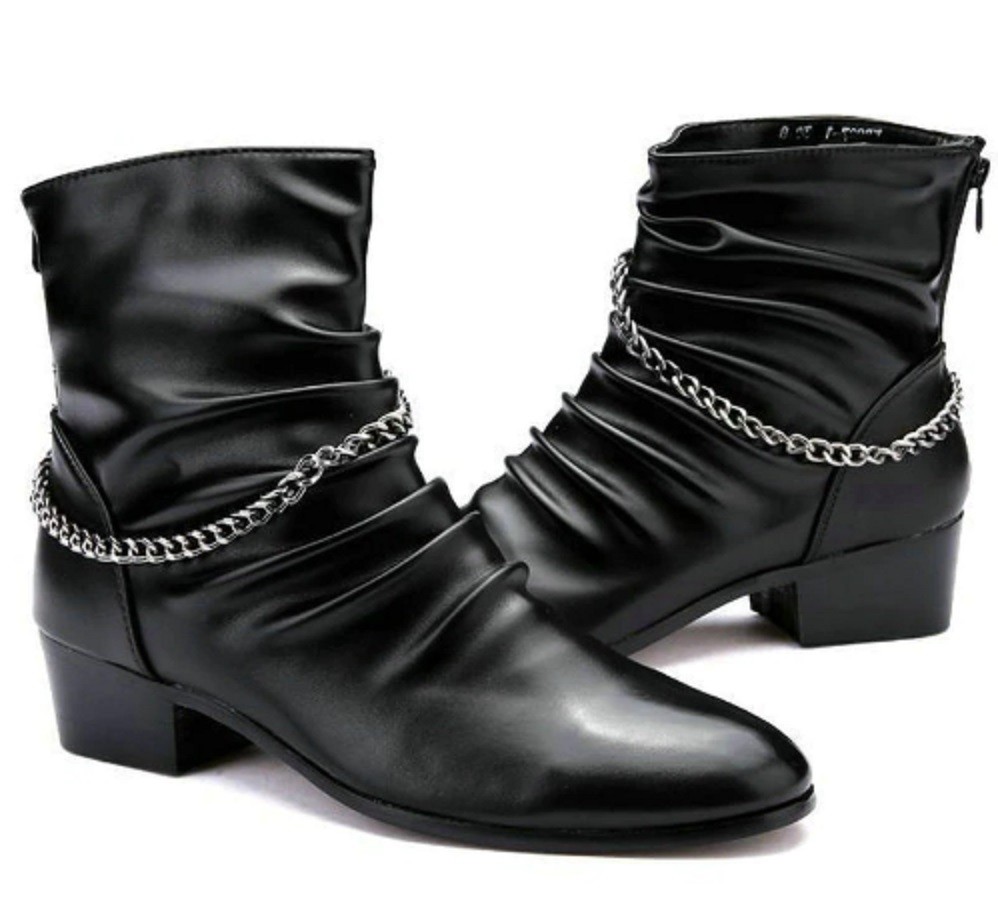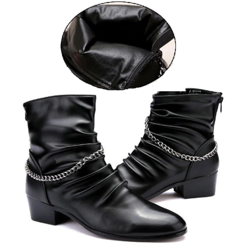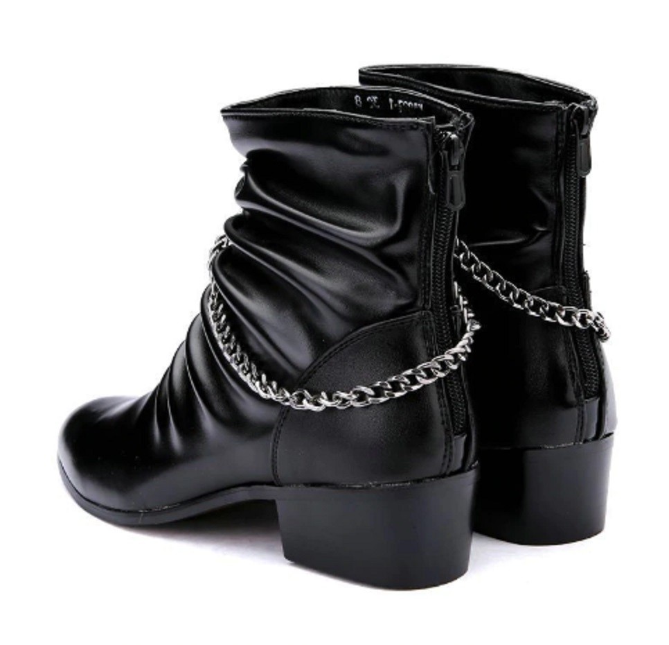 The boots feature a zip fastening and are adorned with a chain.