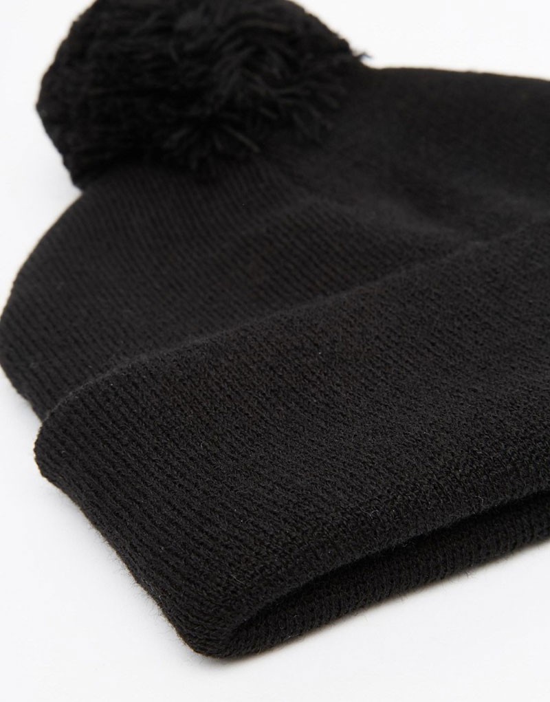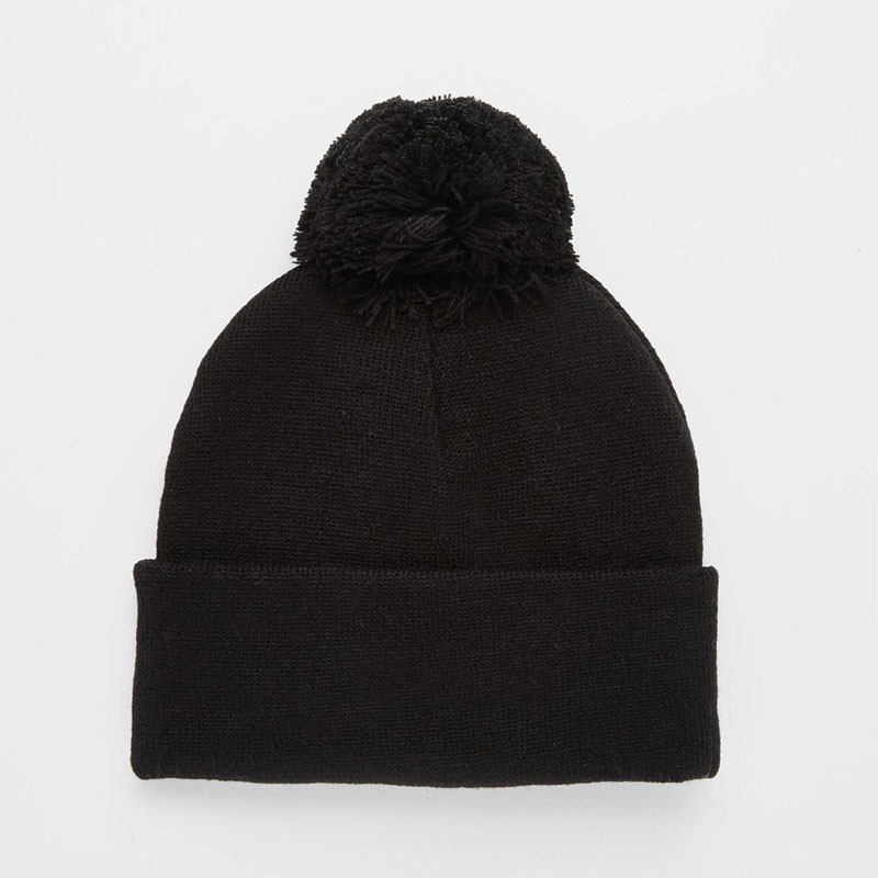 A classic black hat adorned with a black bobble.