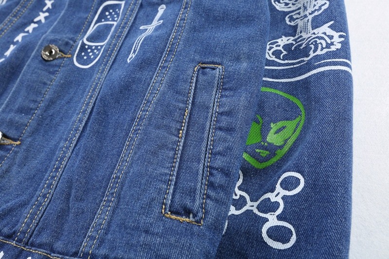 In this denim jacket with prints, you will look fantastic.