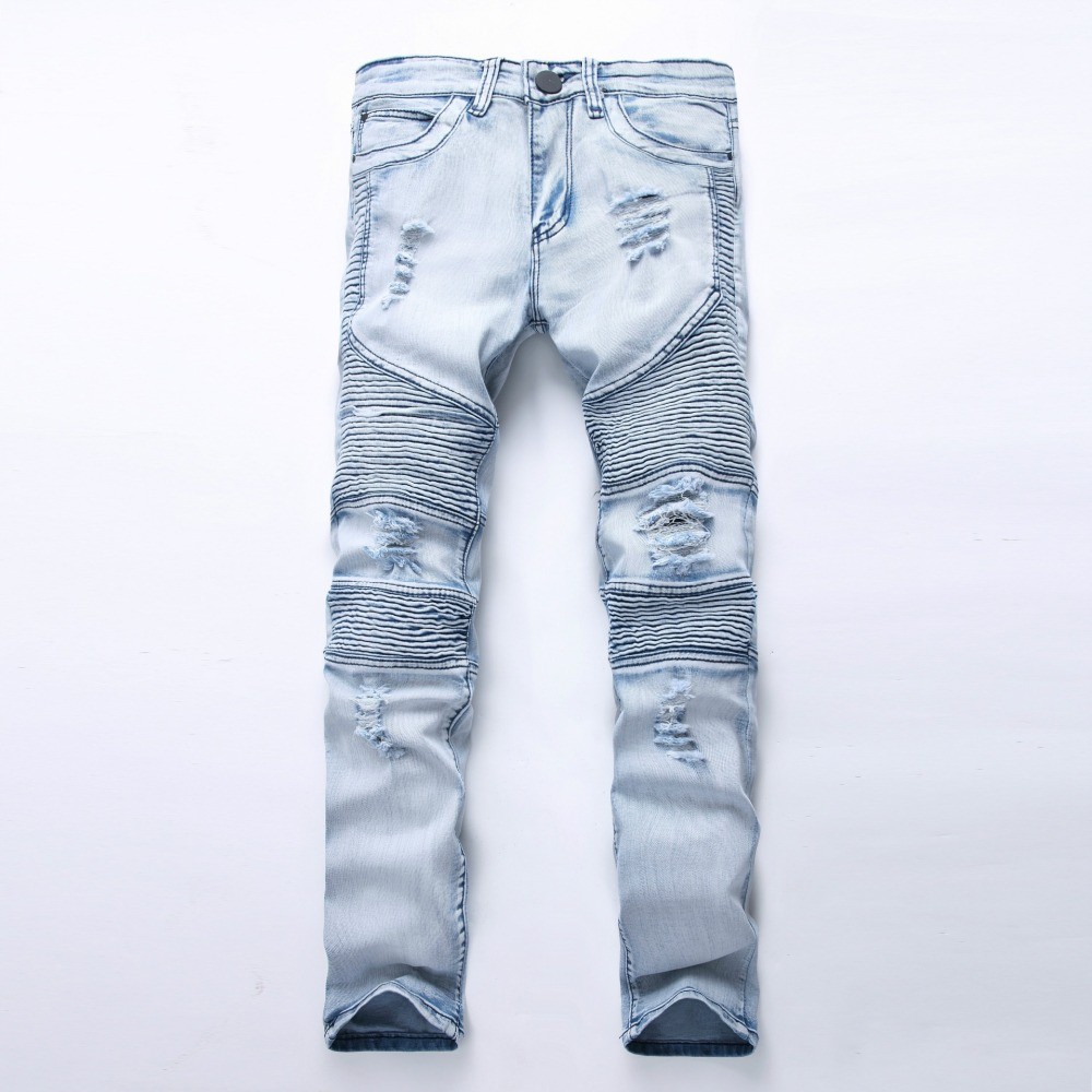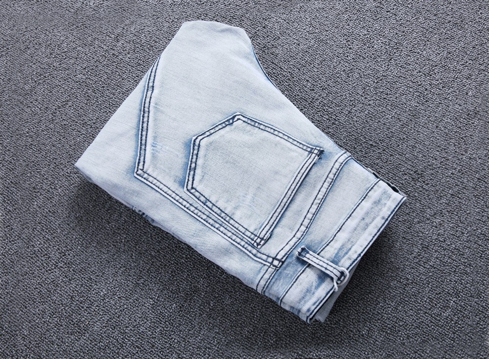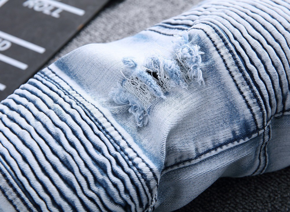 Men's stylish, ripped jeans with stripes on the front.