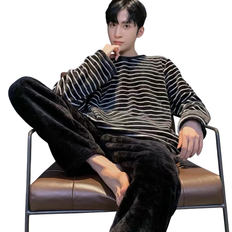 Comfortable men's pyjama set with long sleeves and trousers, striped design and stretchy material suitable for sleeping and home relaxation. Full description