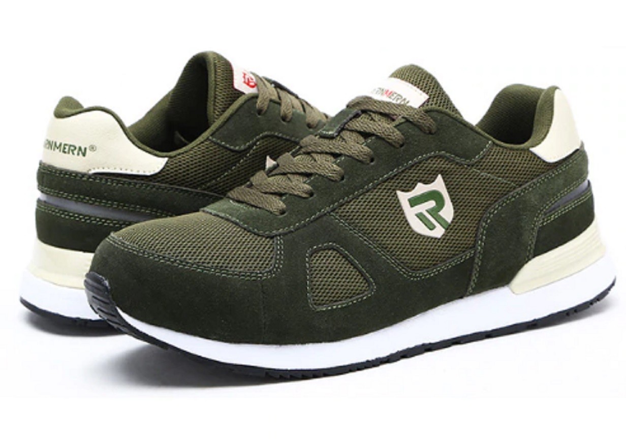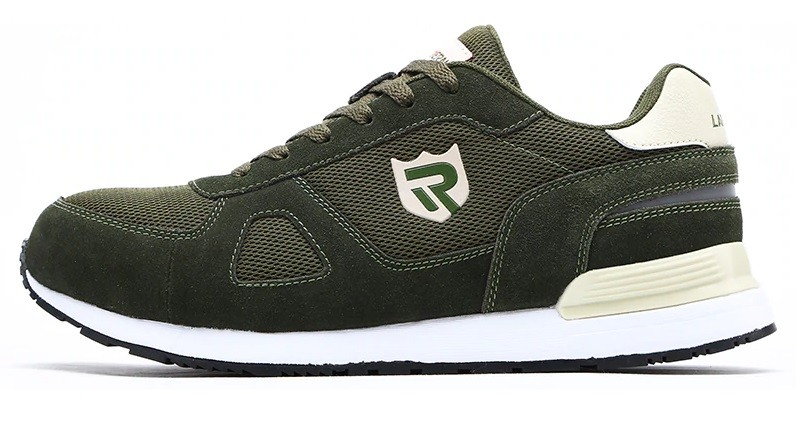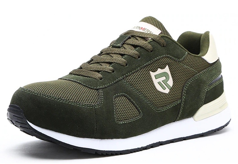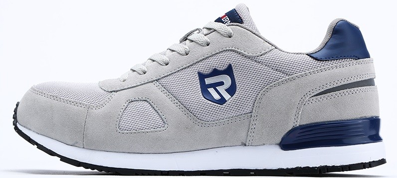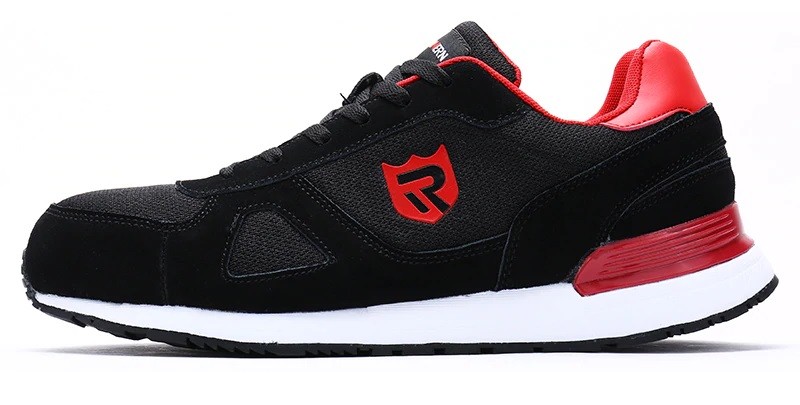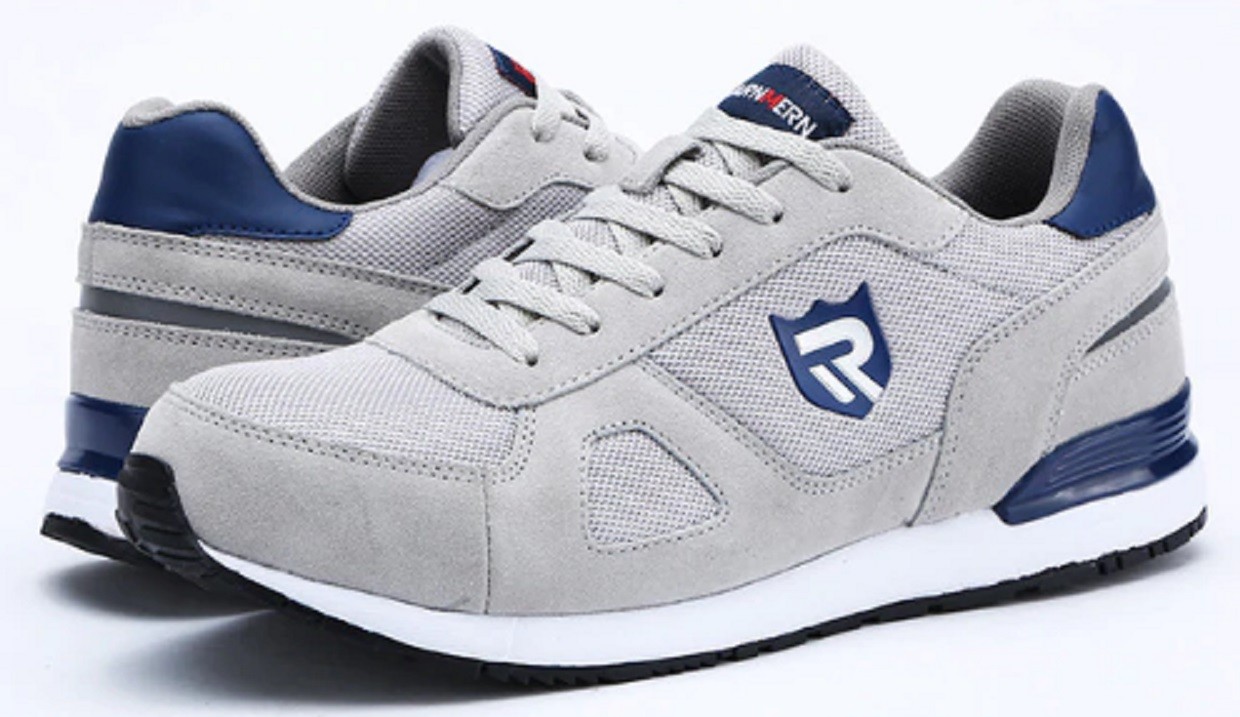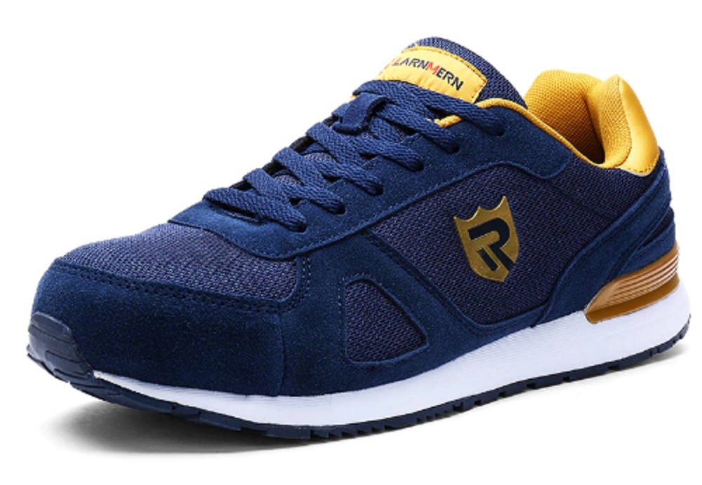 The shoes feature a steel toe cap, a reflective strip on the heel, and are slip-resistant.