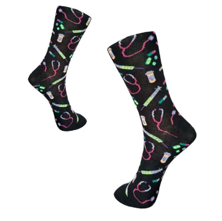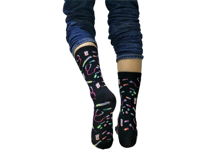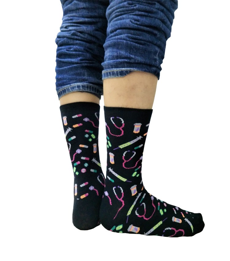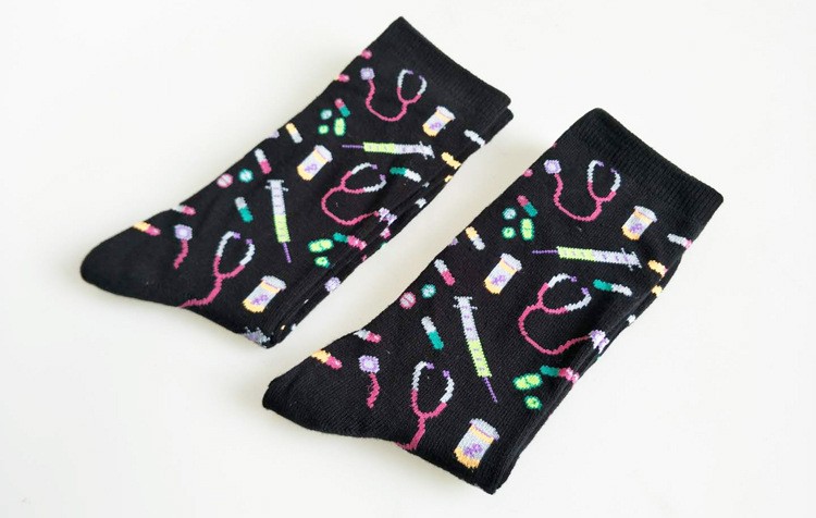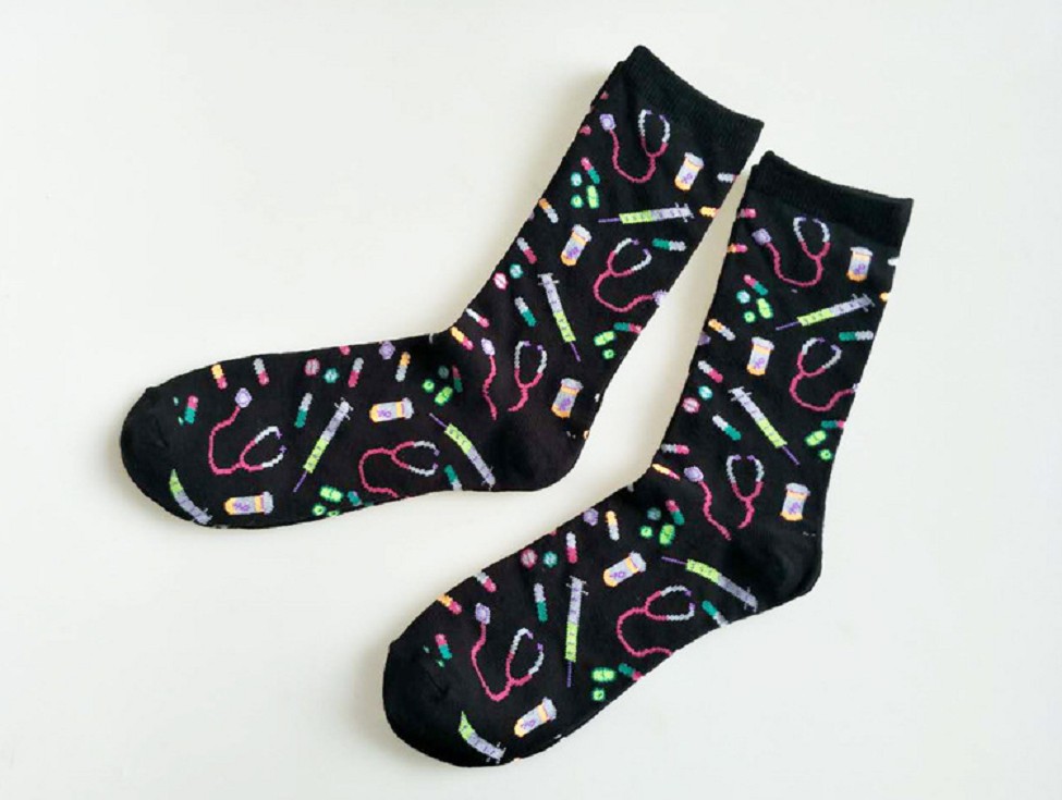 Men's socks featuring prints of stethoscopes, injections, and medications are very imaginative!