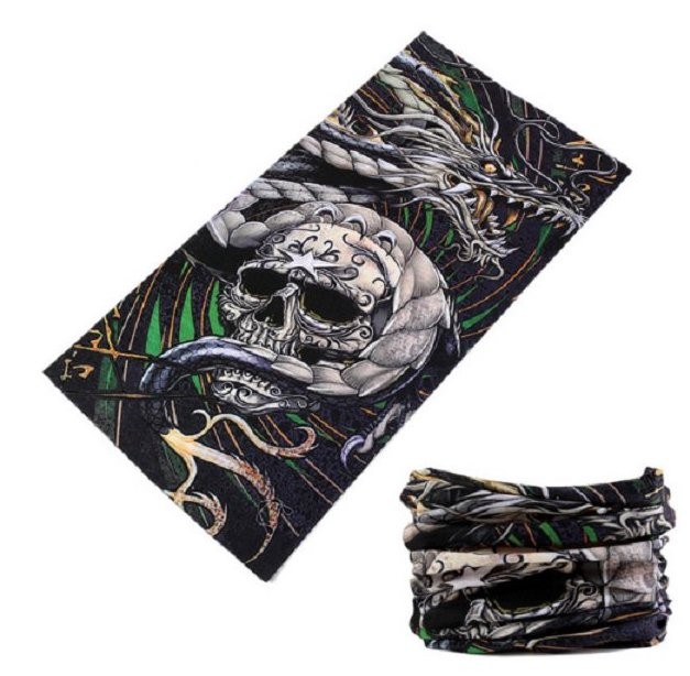 In this neck warmer featuring a dragon and skull print, you will command respect.