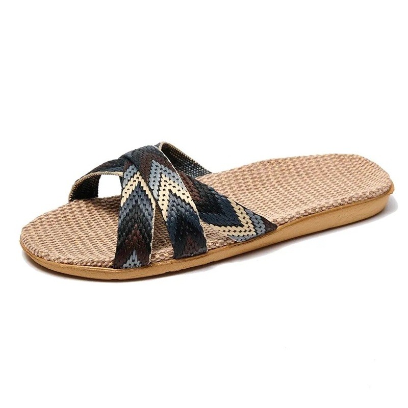 These men's boho slippers catch the eye at first glance thanks to the striking colourful woven straps, which create an attractive criss-cross pattern. The flat sole made from soft material ensures comfort with every step, whether you're moving around at home, on the terrace, or on holiday. The lightweight construction and breathable design are especially appreciated in the warmer months. The slippers are easy to slip on, and their ethno look perfectly complements any casual outfit. They are not only practical but also stylish – an ideal choice for men seeking comfort without compromising on design.