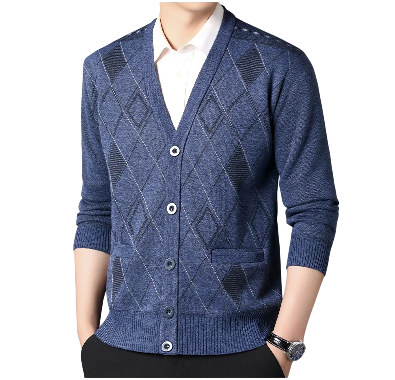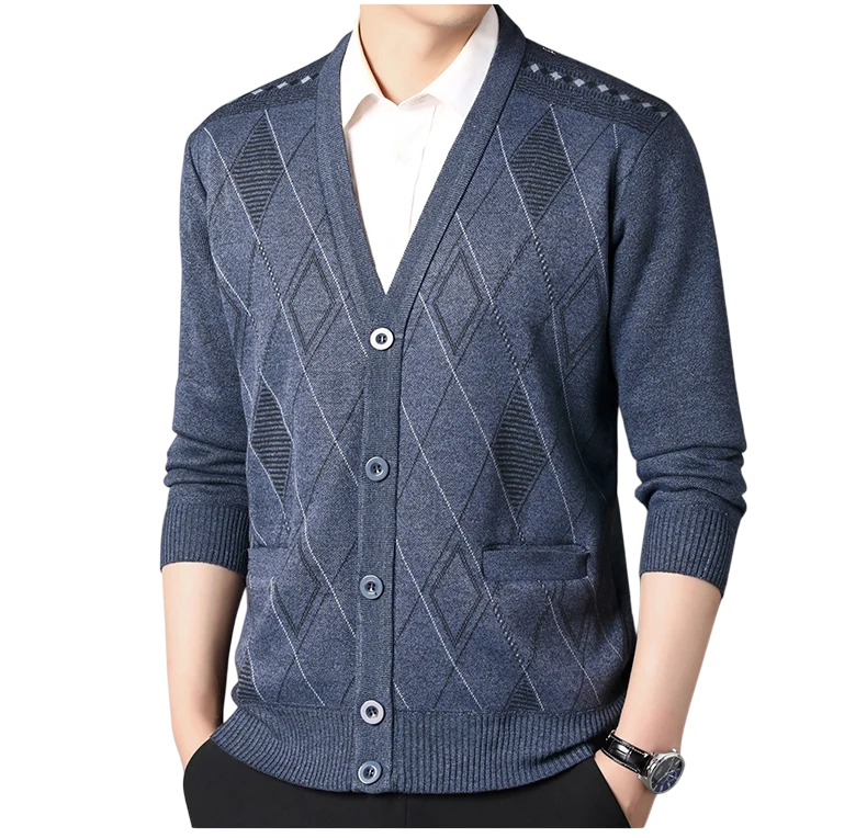 Stylish men's cardigan with a V-neck and button fastening. Ideal for both elegant and casual wear, available in various colours. Full description