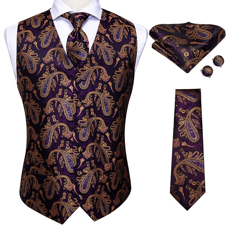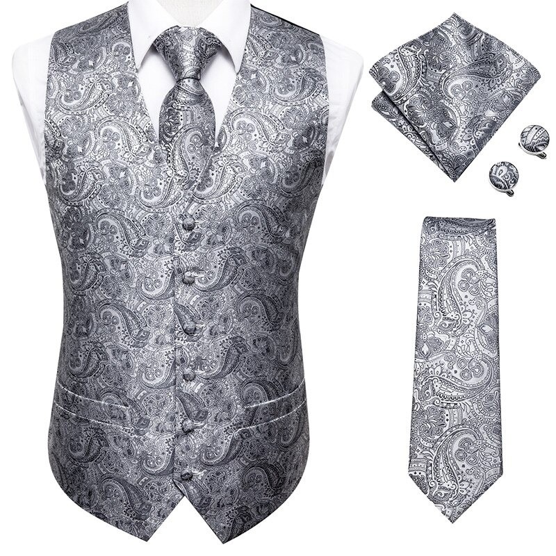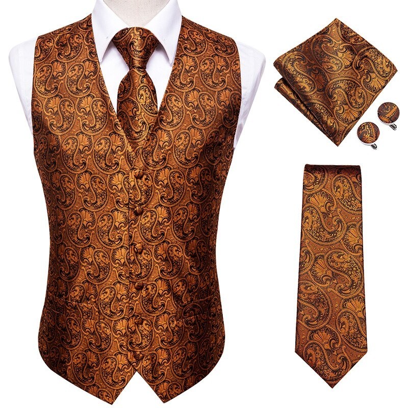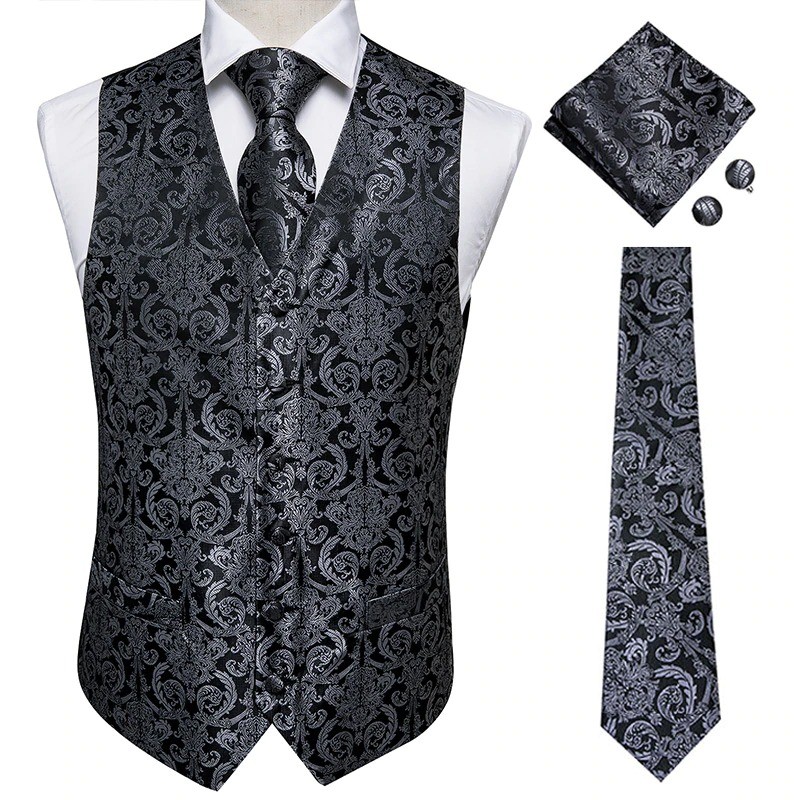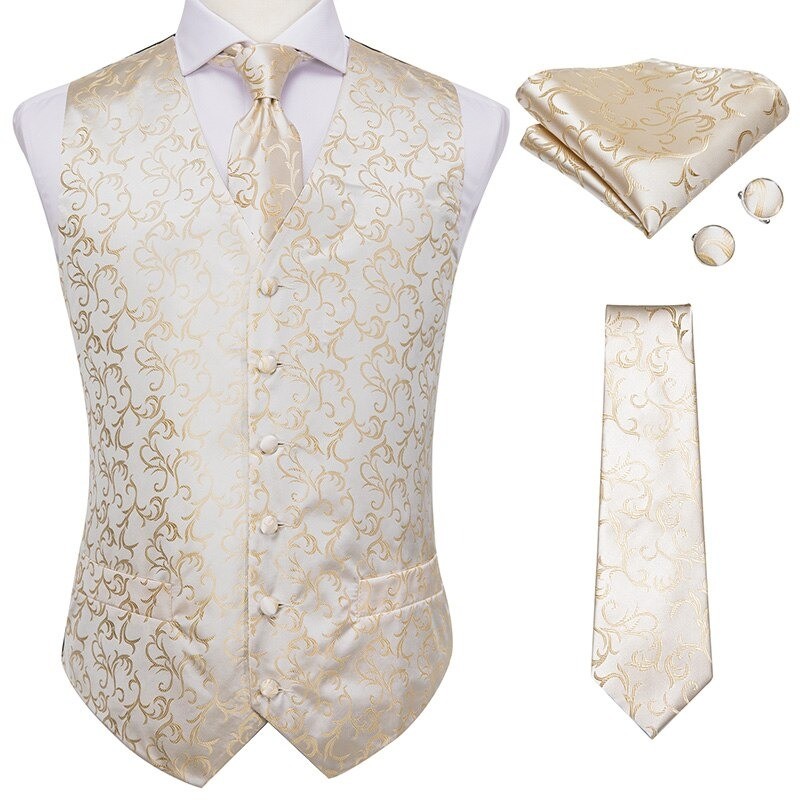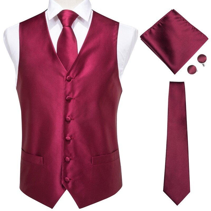 Contents: 1x waistcoat, 1x tie, 1x pocket square, 2x cufflinks
