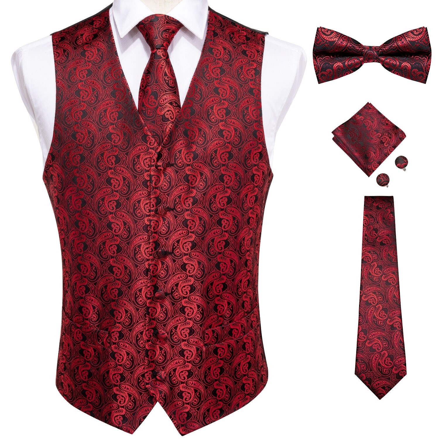 Contents of the package: 1x waistcoat, 1x bow tie, 1x tie, 1x pocket square, 2x cufflinks