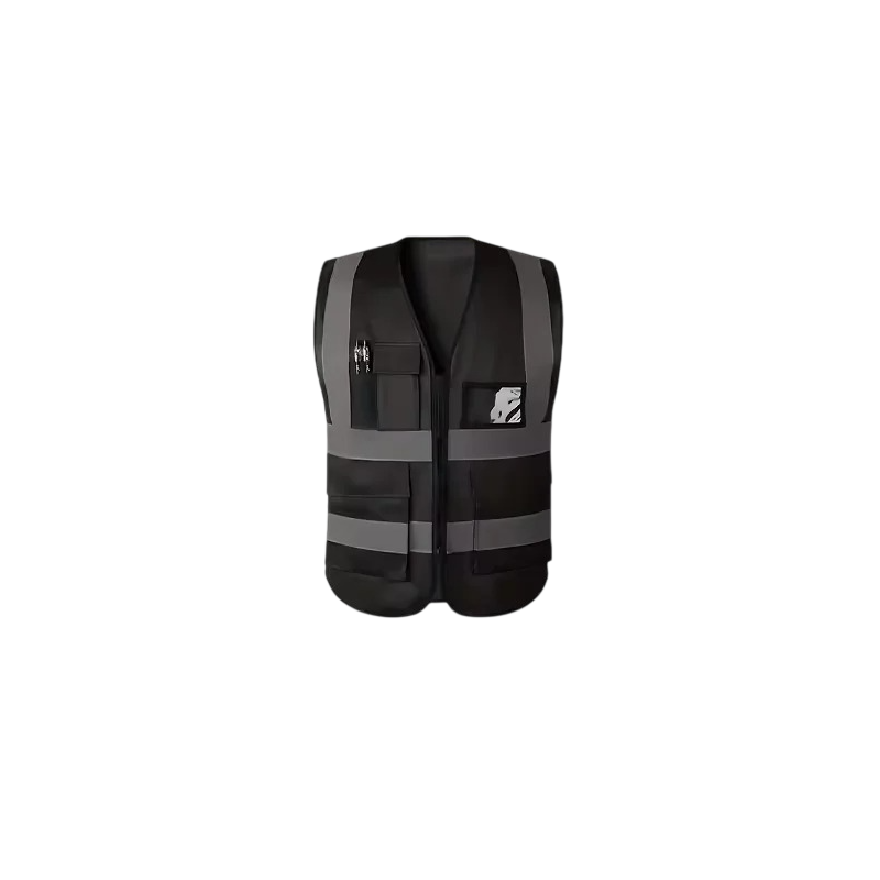 On the front, there are reflective stripes that enhance visibility when working in low-light environments. These reflective elements are placed on the chest and waist areas, creating a striking contrast to the black design of the vest.