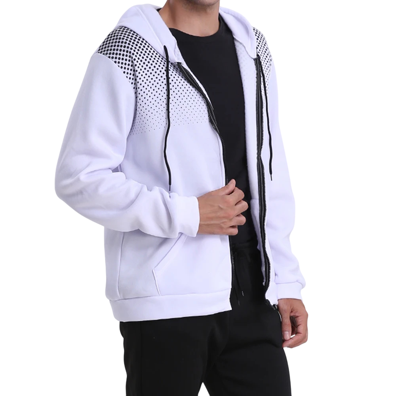 This modern men's zip-up hoodie combines elegant appearance, functionality, and comfort. Made from high-quality polyester that is soft, breathable, and durable, it provides excellent comfort for all-day wear. The solid colour design is complemented by a subtle dot pattern on the shoulders, giving the hoodie a sporty-elegant character. The hood and practical pockets enhance its functionality, while the full-length zip allows for easy dressing and temperature regulation. An ideal choice for sports, travel, leisure, and everyday wear.