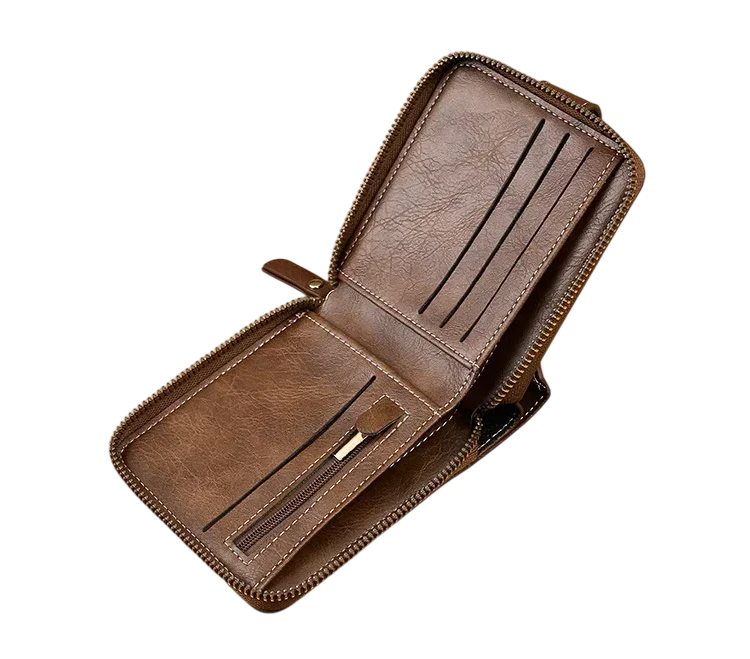 Stylish men's zip wallet made from high-quality PU leather. Dimensions 12 x 9.5 cm, card slots with snap closure, coin pocket, and elegant design. Full description
