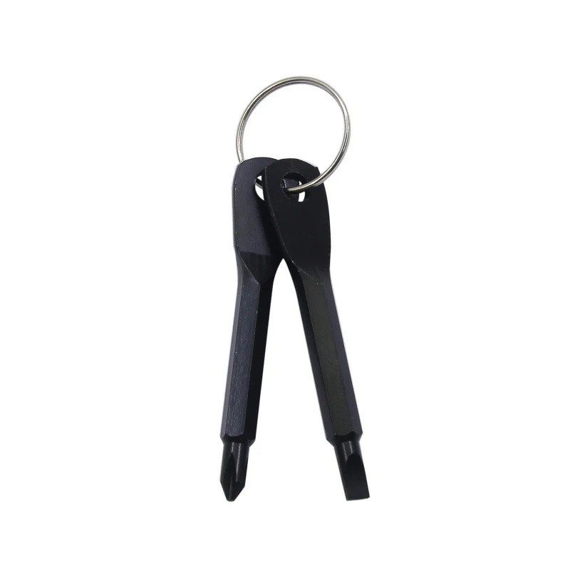 Mini set of flat and cross screwdrivers with a practical loop for keys. Durable metal construction, ideal for pockets or travel. Full description
