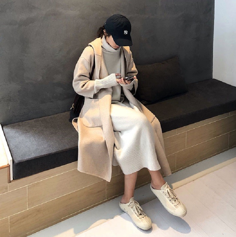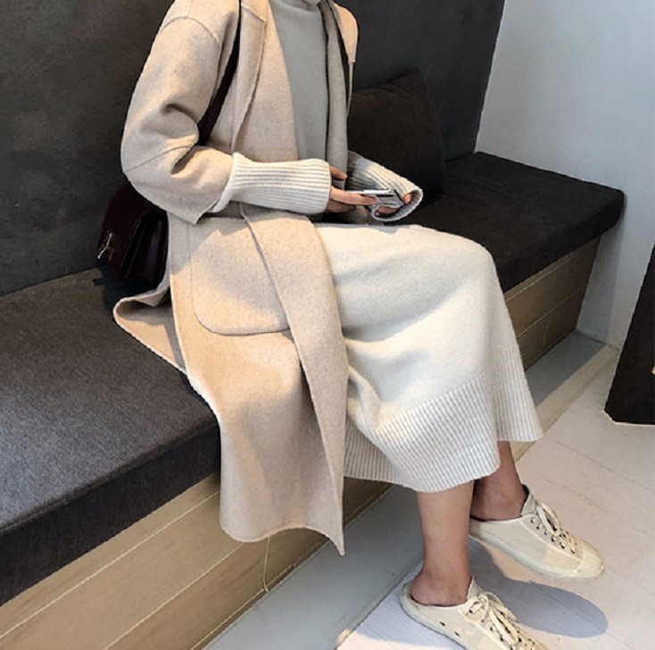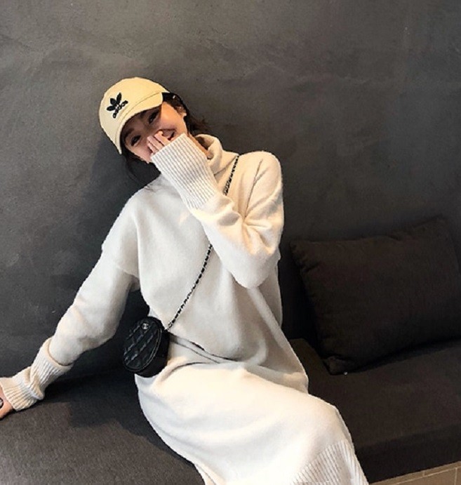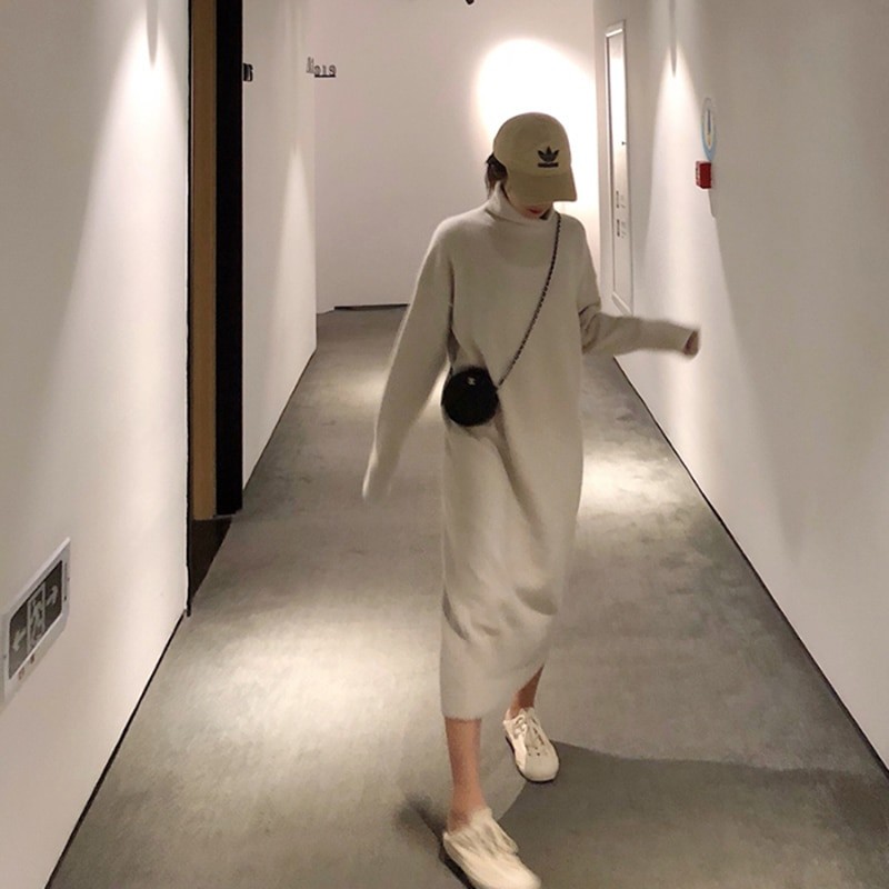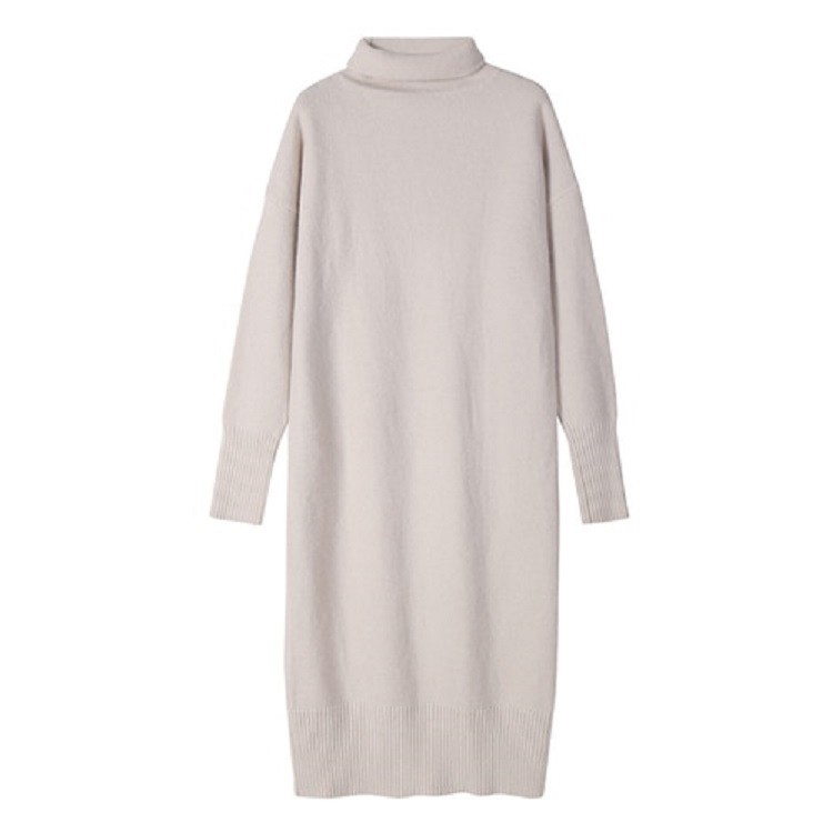 Warm autumn sweater dress with long sleeves and a roll neck.