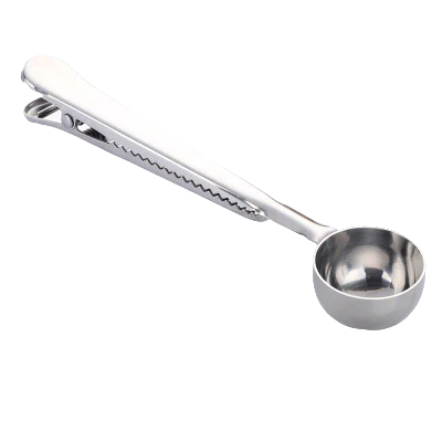 This 18 cm long ladle features a built-in clip that can be used to seal a torn bag, for example. The ladle is made of stainless steel and the scooping part is approximately 3.5 cm wide.