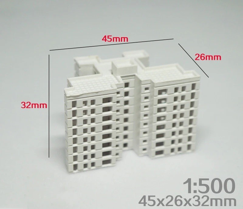 The model measures 45 x 26 x 32 mm and is made from high-quality ABS plastic, which is lightweight and durable. The scale of 1:500 is ideal for detailed model compositions and larger architectural ensembles. The product is supplied as a kit, and the individual parts need to be assembled before use.