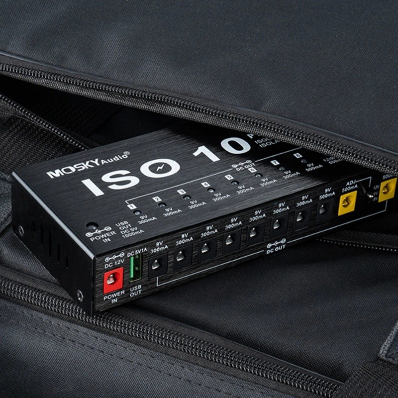 The MOSKY ISO-10 power supply is a reliable and professional solution for simultaneously powering multiple guitar effect pedals. It offers 10 isolated DC outputs with various voltage levels (9V, 12V, and 18V) and a 5V USB port for powering additional devices such as tuners, mobile phones, or lights on the pedalboard. Each output has its own galvanic isolation, which prevents noise and interference in the signal, ensuring a clean and stable sound without hum.