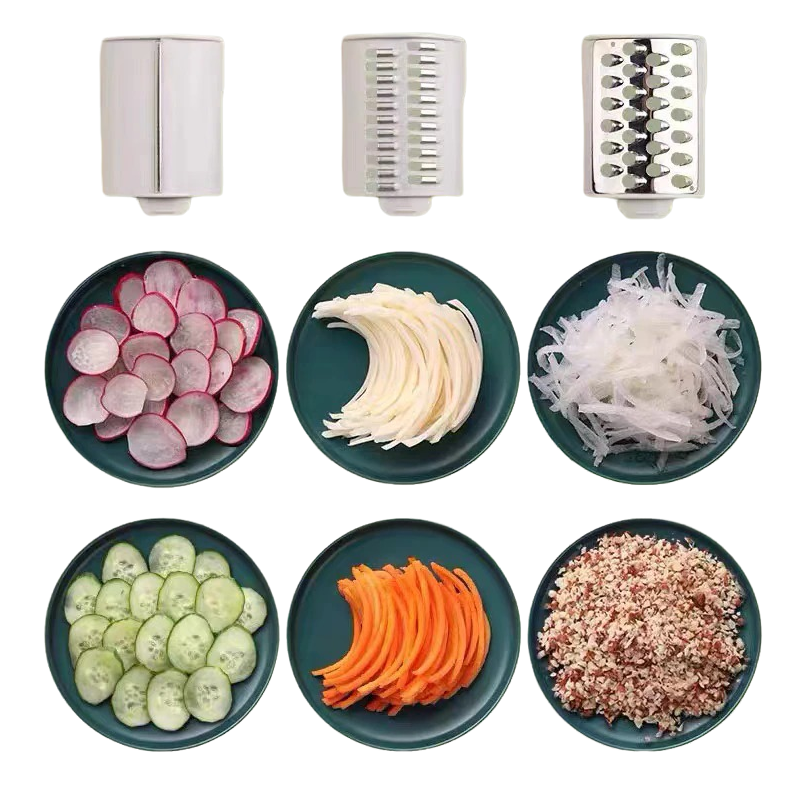 Grater with a handle. Dimensions: 28.5 x 13.5 x 9.2 cm. Three interchangeable blades. Full description