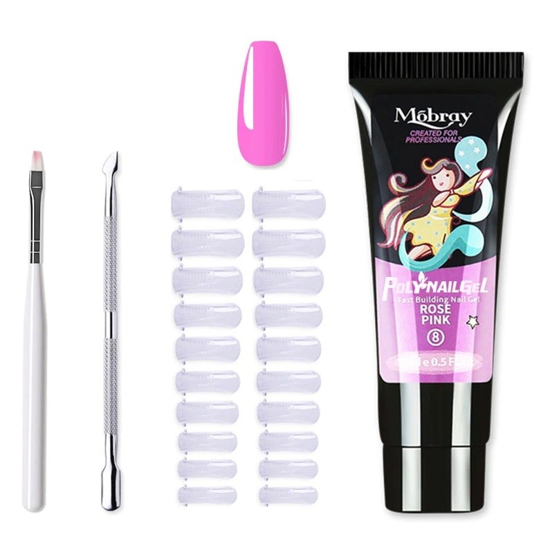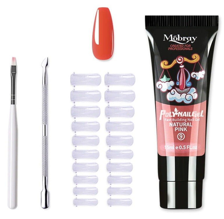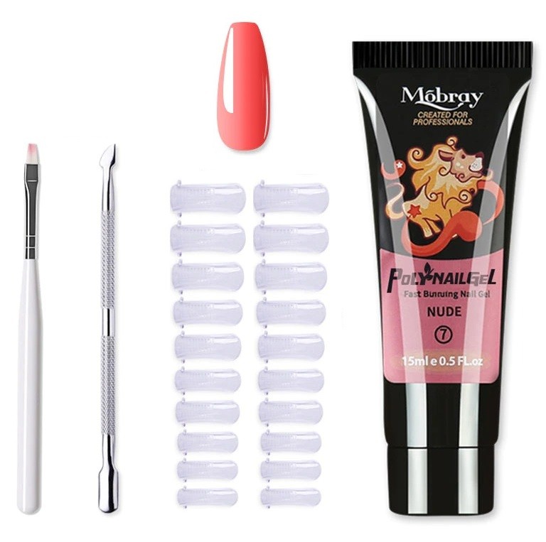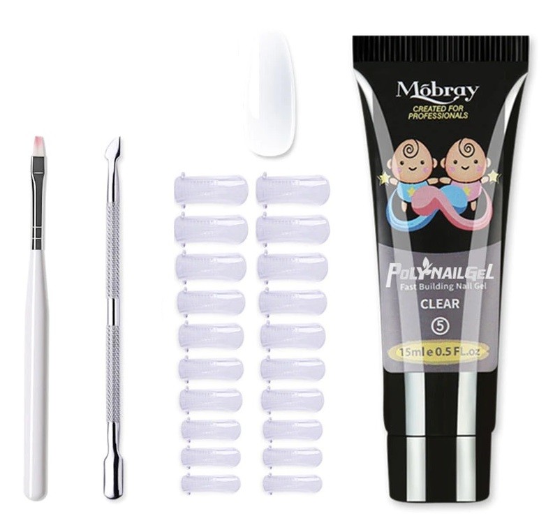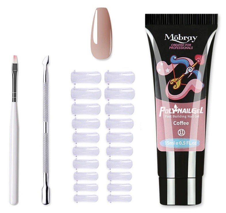 The set includes a double-sided tool for cuticle care, a brush, nail tips, and nail gel. With this set, you can create gel nails at home that look like they were done in a salon. You can choose from 12 colours.