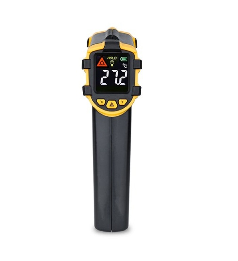 Touchless infrared thermometer with laser sight. It can measure temperature non-contact in 0.5 seconds. Measures in the range of -50°C to 390°C with an accuracy of ± 1°C. Optical ratio 12:1. Values are displayed on a readable LCD screen. It features a history of measured values and an automatic shut-off function. Powered by 2 AAA batteries.