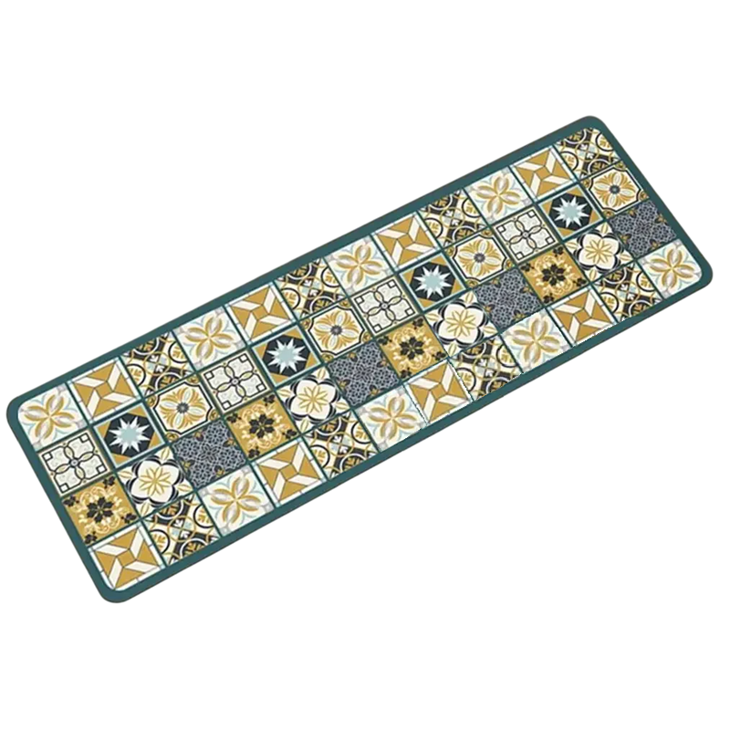 Long soft carpet with a retro pattern and non-slip backing. Absorbent and durable material suitable for kitchen, bathroom, and living room. Full description