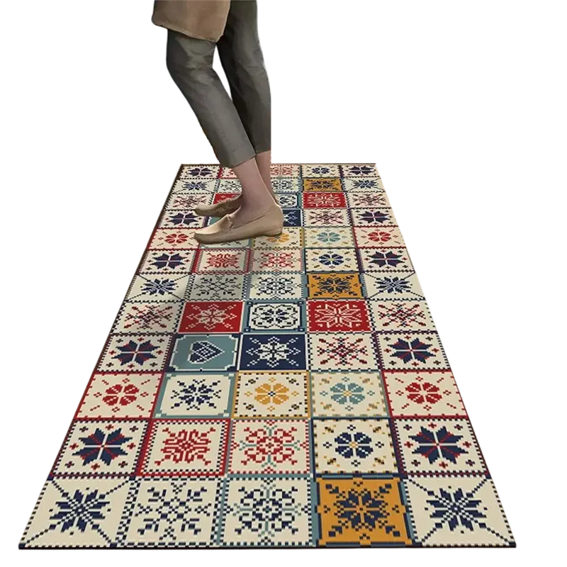 Soft non-slip rug with a retro tile pattern suitable for the kitchen, bathroom, living room, and hallway. Absorbs water and is easy to clean. Full description