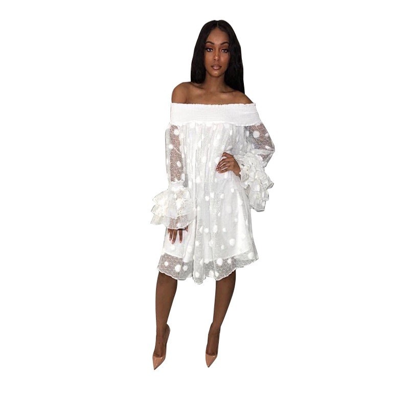 Beautiful romantic dress with off-shoulder design and gathered loose sleeves.