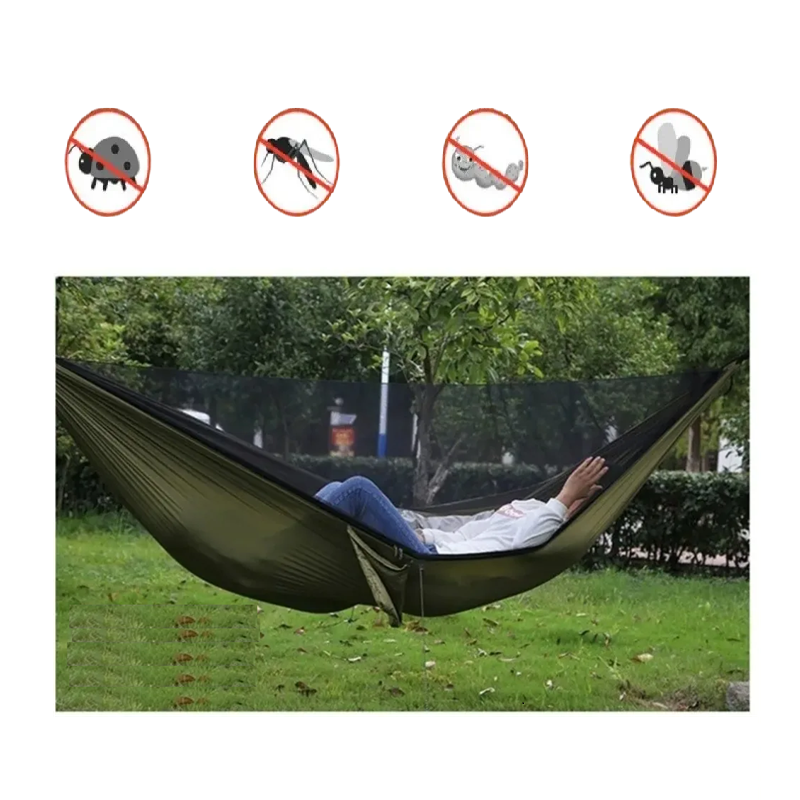 Lightweight and durable hanging hammock with mosquito net for 1–2 persons, ideal for camping, hiking and holidays. Protects against insects, easy to carry and fold. Full description