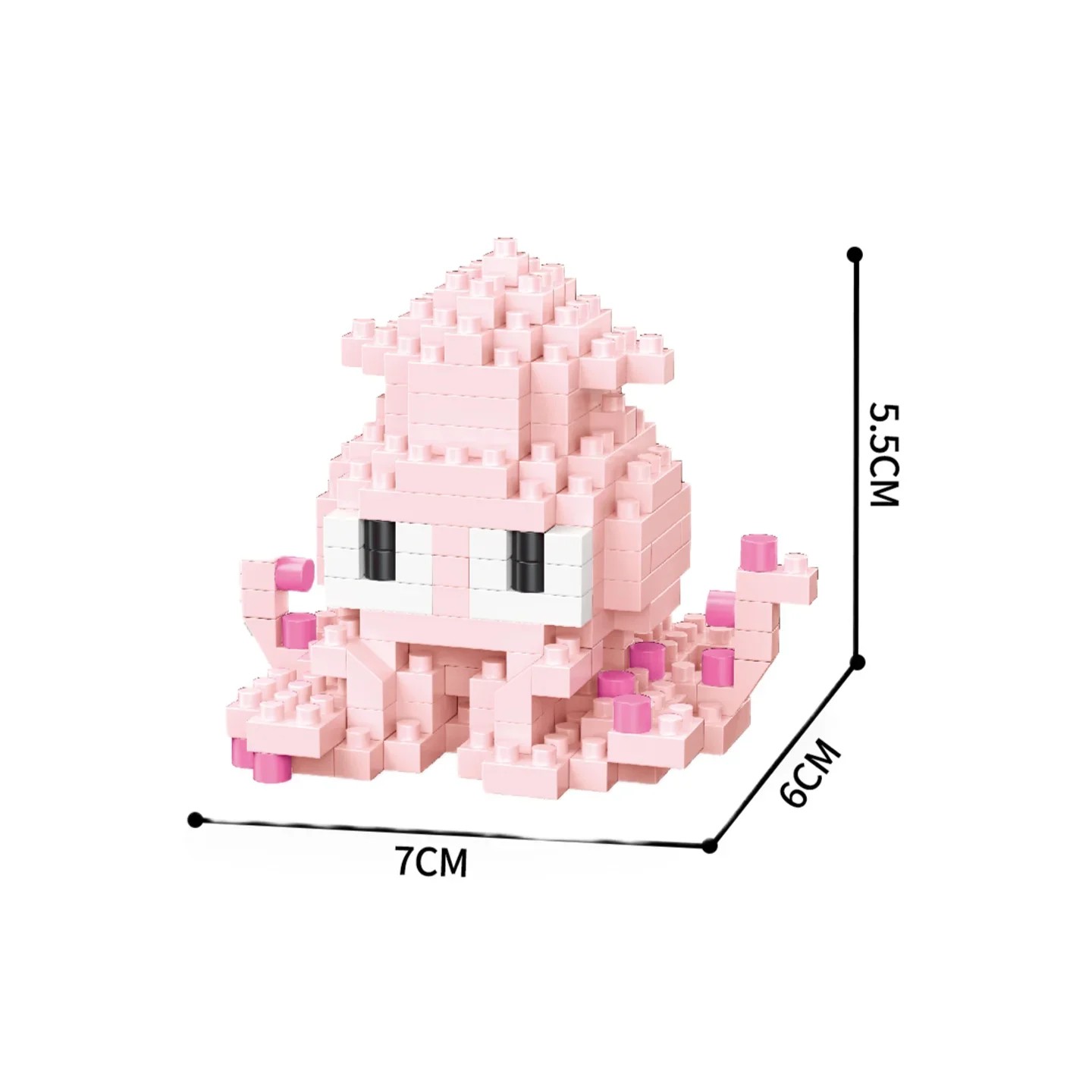 This building set features a cute pink octopus, a popular sea creature with characteristic tentacles and a delicate appearance. The model is made from small blocks in pink, white, and light pink, which together create a friendly face and detailed body shape. With compact dimensions of 7 x 6 x 5.1 cm, the figure is suitable for a shelf, desk, children's room, or alongside other sea-themed building figures. The building set will delight ocean lovers, animal enthusiasts, and fans of soft pastel decorations.