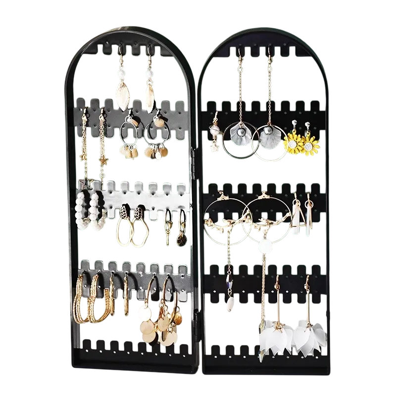 The folding construction allows the stand to be opened during use or folded for space-saving storage. Thanks to the division into several rows, earrings can be hung neatly and kept easily accessible.