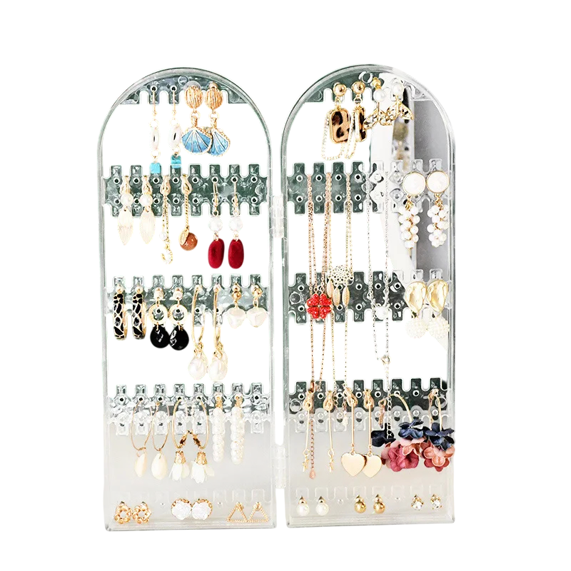 This plastic stand is designed for the organised storage of earrings and other small jewellery items. The structure consists of two folding wings that allow the stand to be opened and provide easy access to the stored jewellery.
