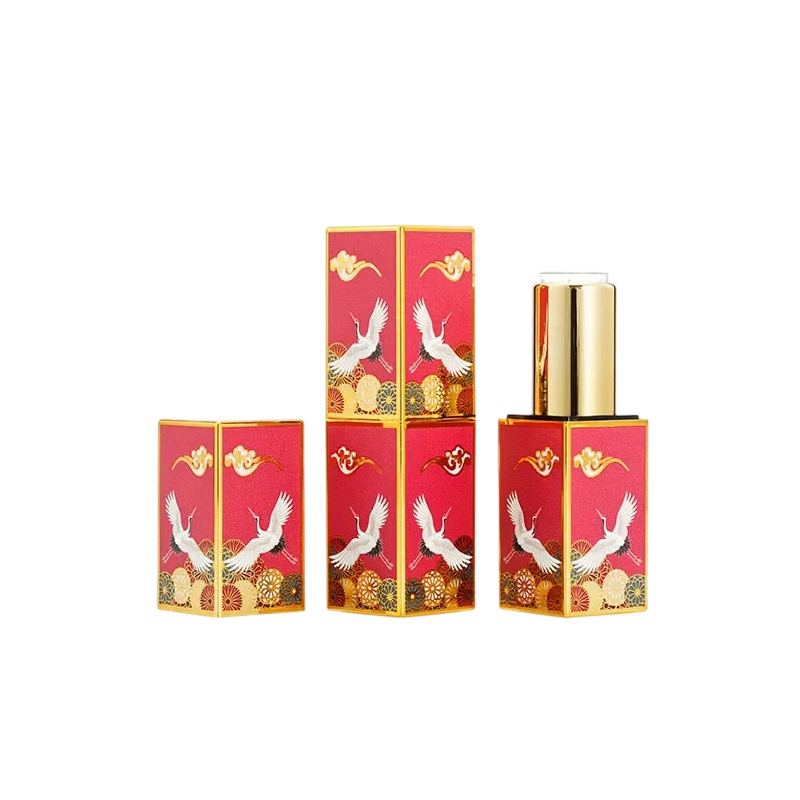 Plastic Lipstick Case with Crane Motif 22 × 74 mm Decorative Design Red Gold Colour for Storing and Carrying Lipstick