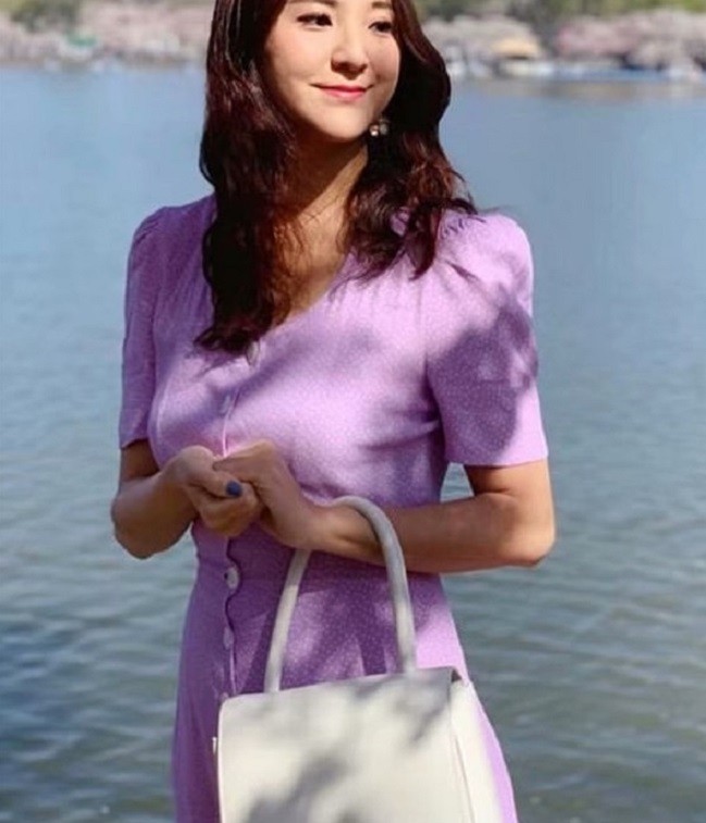 Elegant summer dress below the knee with a small polka dot pattern.