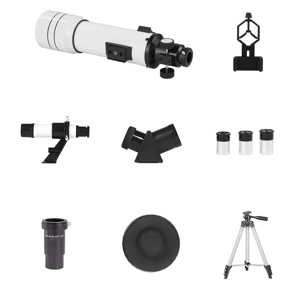 • Package contents: 1x telescope, 1x tripod, 1x mobile phone holder, 1x lunar filter, 1x Barlow lens, 1x zenith mirror, 3x eyepieces